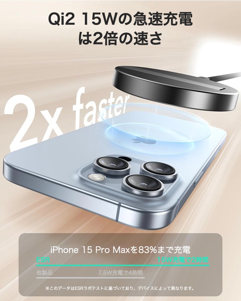 ESR Qi2 ワイヤレス充電器 キックスタンド付き Qi2 15W MagSafe iPhone充電器 iPhone17/Air/17Pro/17Pro Max/16/15/14/13/12シリーズ専用 AirPods 4/3/AirPods Pro 用 ワイヤレス充電パッド 強力マグネット充電 Type-Cケーブル付き 急速充電器