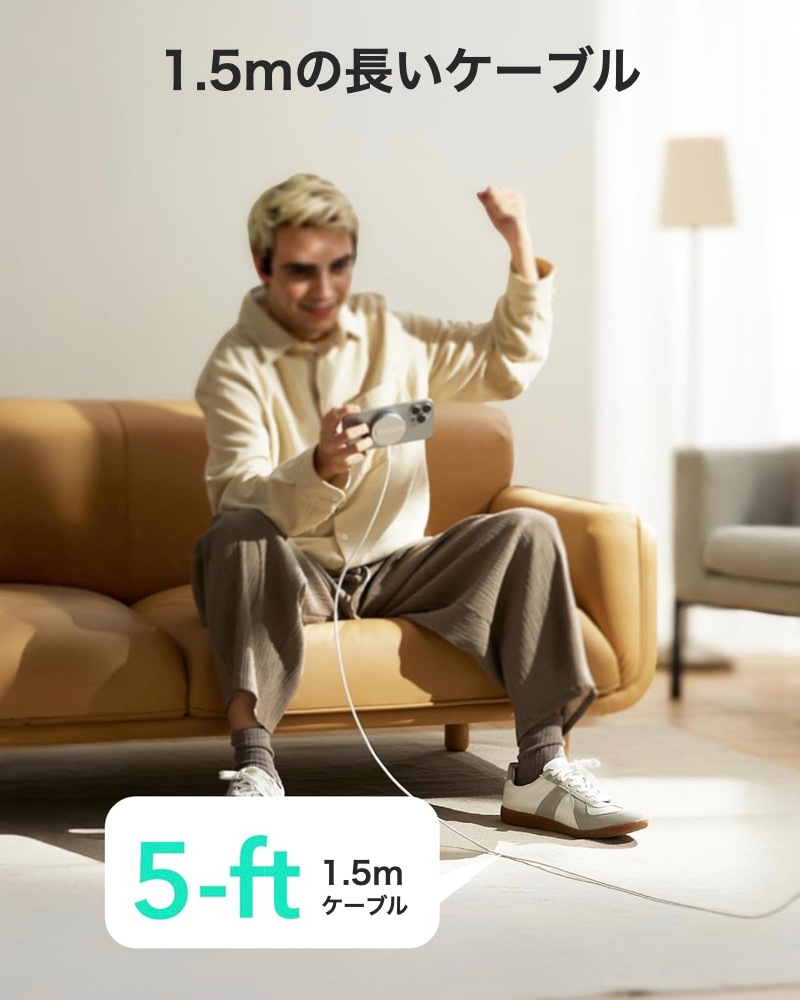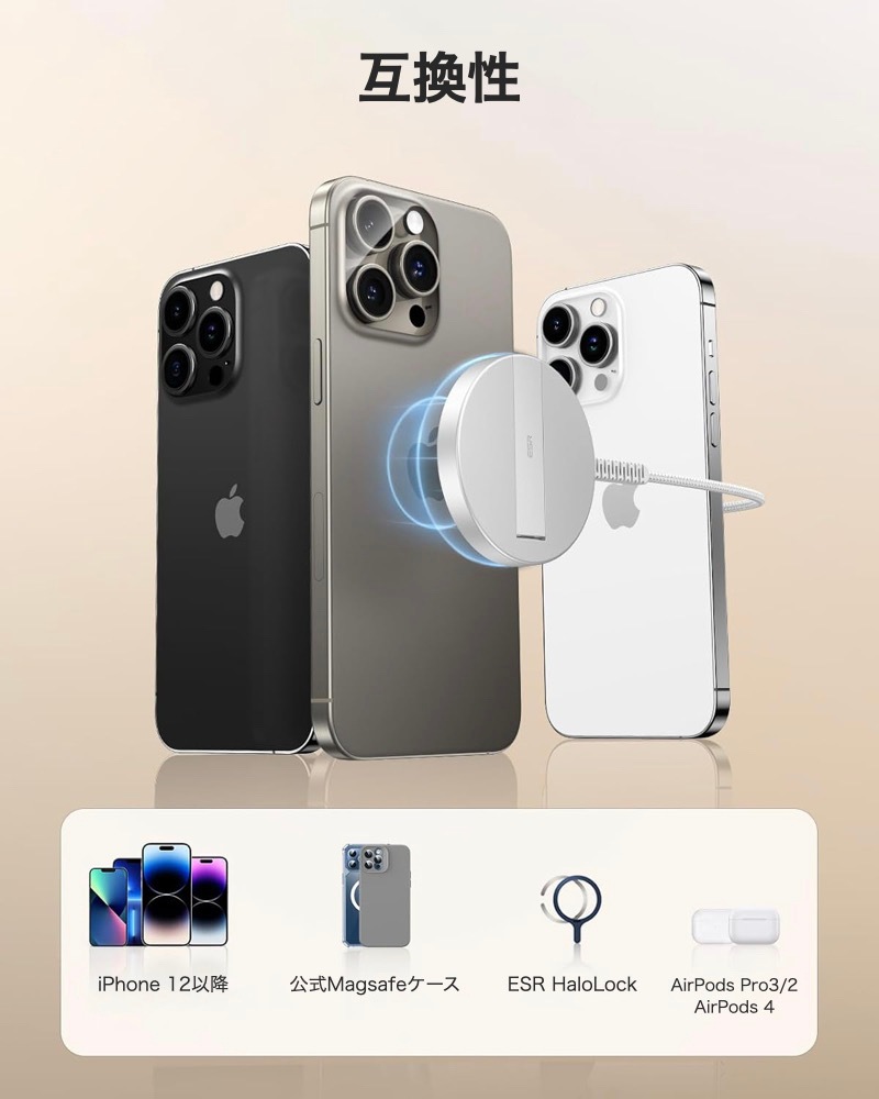 【Qi2認定急速充電】 正式にQi2認証された15W MagSafe iPhone充電により、安全で信頼性の高い高速充電が行えます。 【強力マグネットロック】 1,200gの保持力を持つ強力なマグネットリングが、スマホを充電器にしっかりと吸着固定します。 【急速ワイヤレス充電】 MagSafeに対応しており、iPhone 16/15/14/13/12シリーズを簡単に急速ワイヤレス充電できます。公式のmagsafe電話ケースまたはESR magsafe電話ケースを使用してください。その他のどのiPhoneのモデル(iPhone7/8/SE2/SE3/X/Xs/XR/11/11 Pro/11 Pro Max)にも対応していないので、ご注意ください。 【効率的に充電】 高い熱管理技術により、2.5時間で0から100%まで急速充電します。 【便利なキックスタンド】 必要な時だけ立てて使えるキックスタンドにより、充電しながら家族や友達とビデオ通話できます。 【便利な長さのケーブル】 USB-Cケーブルは長さ1.5 mなので充電中も自由に移動でき、ケーブルを取り外してポータブルスタンドとして使うことも可能です。 【高級感のあるデザイン】 スタイリッシュなアルミニウムボディは丈夫で高級感があります。 |