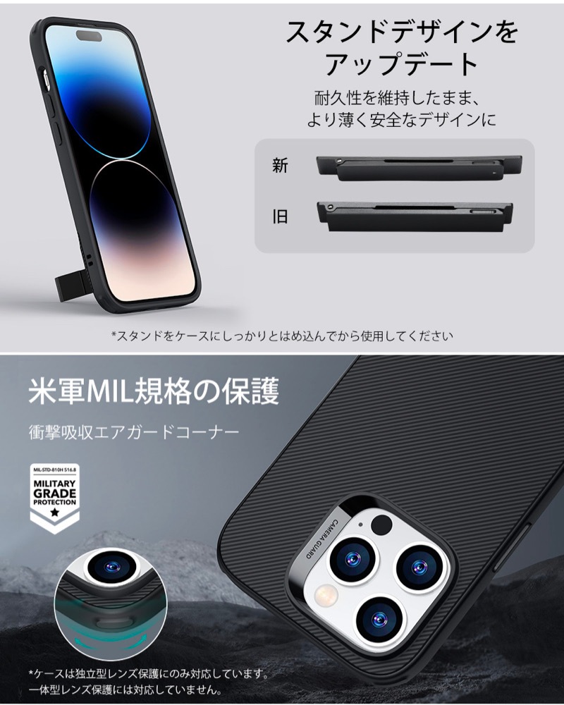 【対応機種】 カメラガードキックスタンド備わったことで、充電コイルに影響せず、ワイヤレス充電が容易に。 【3wayスタンドモード】 3つのスタンドモードでハンズフリーに、より快適なビューを。 【自在に調整可能なキックスタンド】 最大 60 度まで自由に角度を選択でき、特許取得済み。耐久性のあるヒンジは、3,000 回以上の使用後も通常使用できることを実証済み。 【米軍MIL規格の保護】 衝撃吸収エア ガードコーナー、隆起したスクリーンエッジとカメラガードが組み合わさり、落下や衝撃、傷からしっかりとスマホを保護。 【優れたルックス・感触】 快適なグリップを実現した柔らかいポリマーの側面と、傷がつきにくく、黄ばまない丈夫なアクリルの背面の組み合わせで、クリスタルクリアな状態を長時間維持。 ※商品ページ内、レンズ保護については、カメラ専用の保護フィルムのことです。 一体型カメラ保護フィルムには未対応、個別のカメラ保護フィルムには対応しております。 |