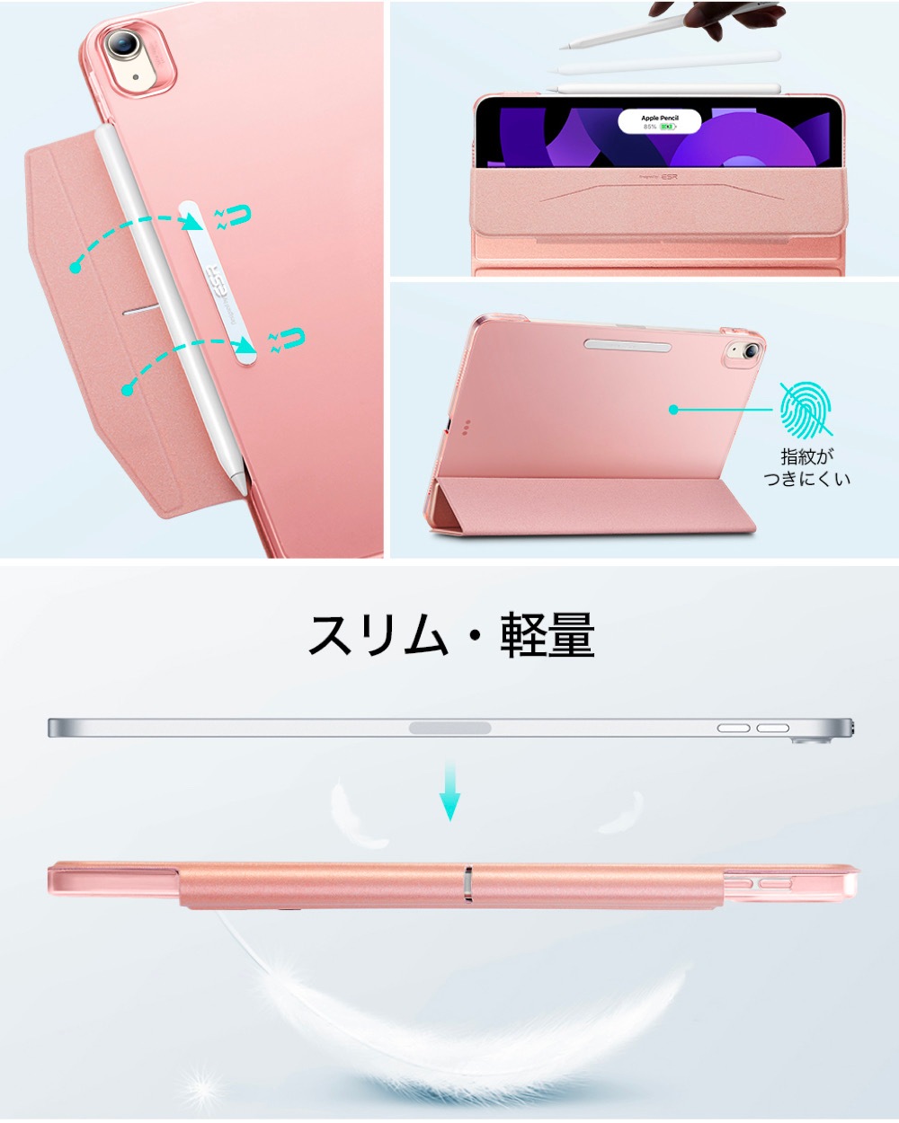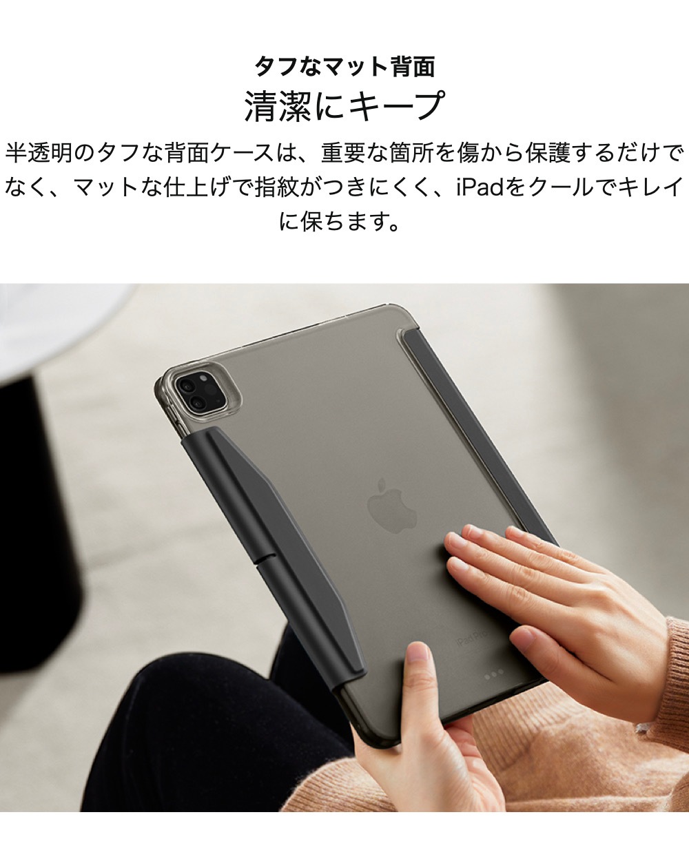 【全面的保護】フロントカバーと半透明ケースが、スリムさと軽量さを保ちつつ、iPadを日常生活の衝撃や傷から保護します。 【スマートカバー】オートスリープ/ウェイク機能が毎回素早く作動します。三つ折り磁気カバーは鑑賞モードとタイピングモードの両方に対応しています。 【APPLE PENCIL対応】側面の特別な切り欠きにより、Apple Pencil 2の磁気アタッチメントやワイヤレス充電といった新機能に対応しています。 【機能的な留め具】Apple Pencilを取り付けていてもいなくても、iPadをしっかりとカバーして保護できるように特別に設計されています。 ・洗練された色彩 ・スリムフィット ・丁寧な仕上がり、長時間の使用に耐えられる ・カバー表面はほぼ純正に近い質感の素材を使用 ・カバー裏面はソフトなマイクロファイバーライニングを使用し、iPadスクリーンを優しく守る ・背面にはハートなPC素材を使用し、マットタイプデザインにより指紋や油汚れがつけ難い マグネット内蔵でオートスリープ機能を実現、しかも鞄の中にもカバーを閉めたままキープ 人間工学に基づくスタンド角度(動画鑑賞モード65°)(タイピングモード30°) ・各ボタンまでカバー、精確なスピーカー穴カットアウト、隅々までカバーする保護力 |