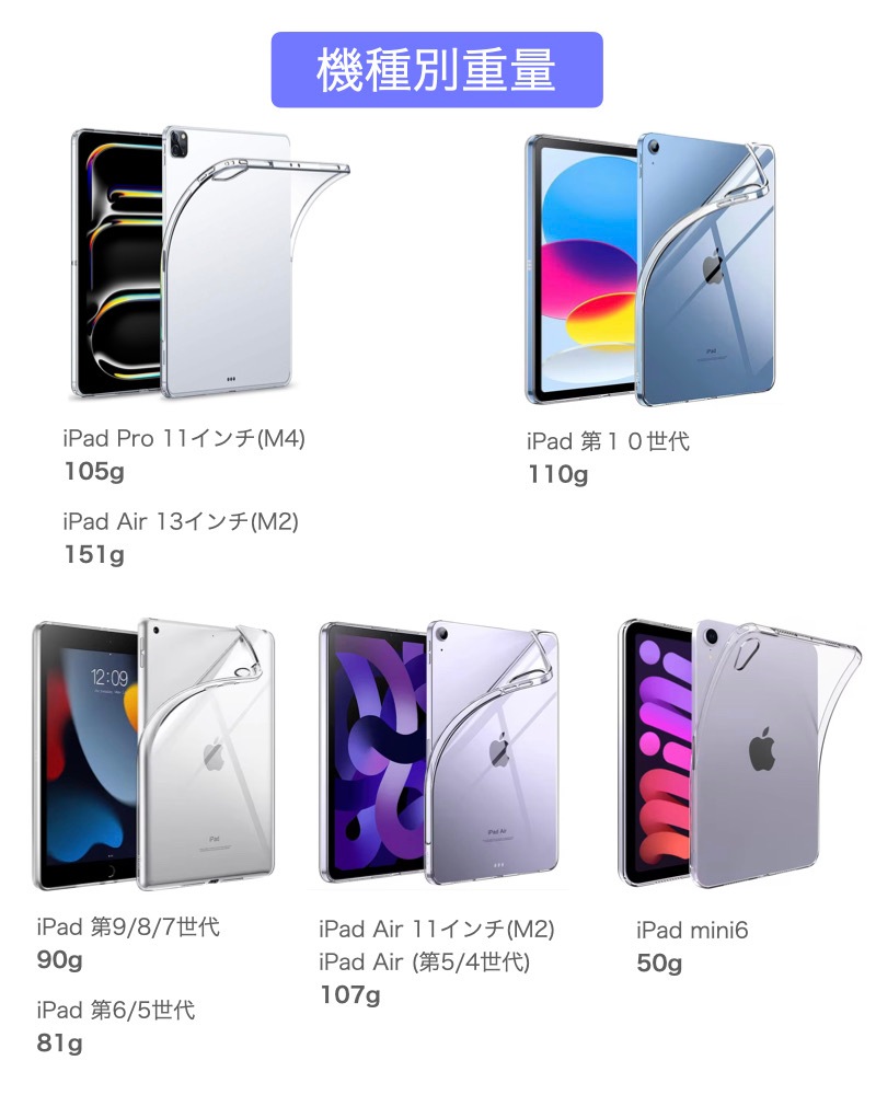 兎にも角にもシンプル! ●シンプルなデザイン。 ●無駄のない形状で、とっても使いやすい。 スリムでスマート! ●薄型・軽量タイプ。 ●iPad本体の保護と持ちやすさに焦点を当てたiPadケースです。 ソフトタイプ ●iPad本体の傷付き防止。 ●柔らかいTPU(熱可塑性ウレタン素材)をしたiPadケースです。 iPad専用設計 ●iPadケースを装着したまま、充電ができます。 ●カメラもカバーし、しっかりと保護してくれます。 ●イヤホンもiPadケースを装着したまま、ご使用いただけます。 ※iPadのモデルや、入荷時期によって仕様が異なる場合がございます。 |