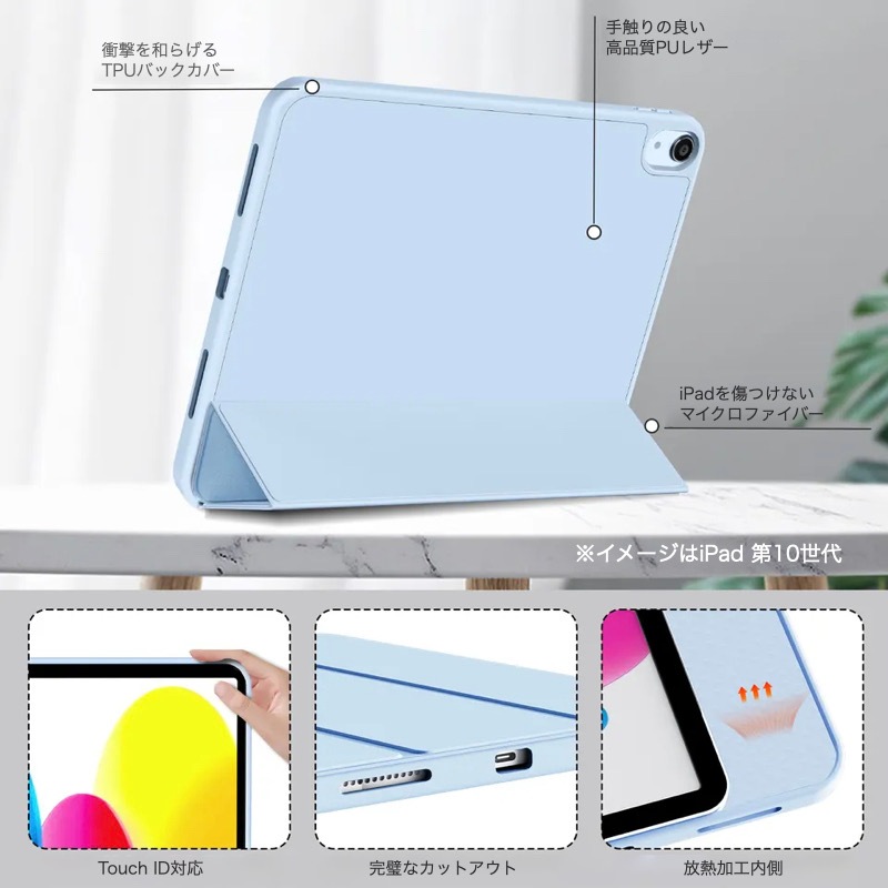 【Apple Pencilユーザーのためのケース】 サイズぴったりのペンホルダーはもちろん、 キャップ・アダプタ用のホルダーやペン立ても付いた、Apple Pencilの使用に最適なケースです。 ※Apple Pencilは付属しません。 【三つ折りフロントカバー】 風呂ふた仕様の三つ折りのフロントカバーは、高品質なPUレザー素材で仕上げられており、この価格では想像できないおしゃれで高級感のあるケースになっています。 三つ折りフロントカバーには、複数のマグネットが均等に内蔵されています。 【安定したスタンド機能】 フロントカバーに内蔵された複数のマグネットにより、安定したスタンド機能をご利用いただけます。 タイピングや動画視聴などiPadを立ててご使用の際に、とても便利にご利用いただけます。 【オートスリープ機能】 オートスリープ機能で、バッテリーが無駄に消費してしまうのを防ぎます。 |