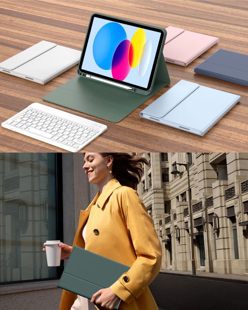 【ワイヤレス方式】 BT 3.0 【キー配列】 英語配列(80キー) 【充電ポート】 Micro USB 【内容品】 ・iPadカバー ・キーボード ・Micro USB充電ケーブル 【安定したスタンド機能】 フロントカバーに内蔵された複数のマグネットにより、安定したスタンド機能をご利用いただけます。 タイピングや動画視聴などiPadを立ててご使用の際に、とても便利にご利用いただけます。 【オートスリープ機能】 オートスリープ機能で、バッテリーが無駄に消費してしまうのを防ぎます。 【Apple Pencilユーザーのためのケース】 サイズぴったりのペンホルダーはもちろん、 キャップ・アダプタ用のホルダーやペン立ても付いた、Apple Pencilの使用に最適なケースです。 ※Apple Pencilは付属しません。 |