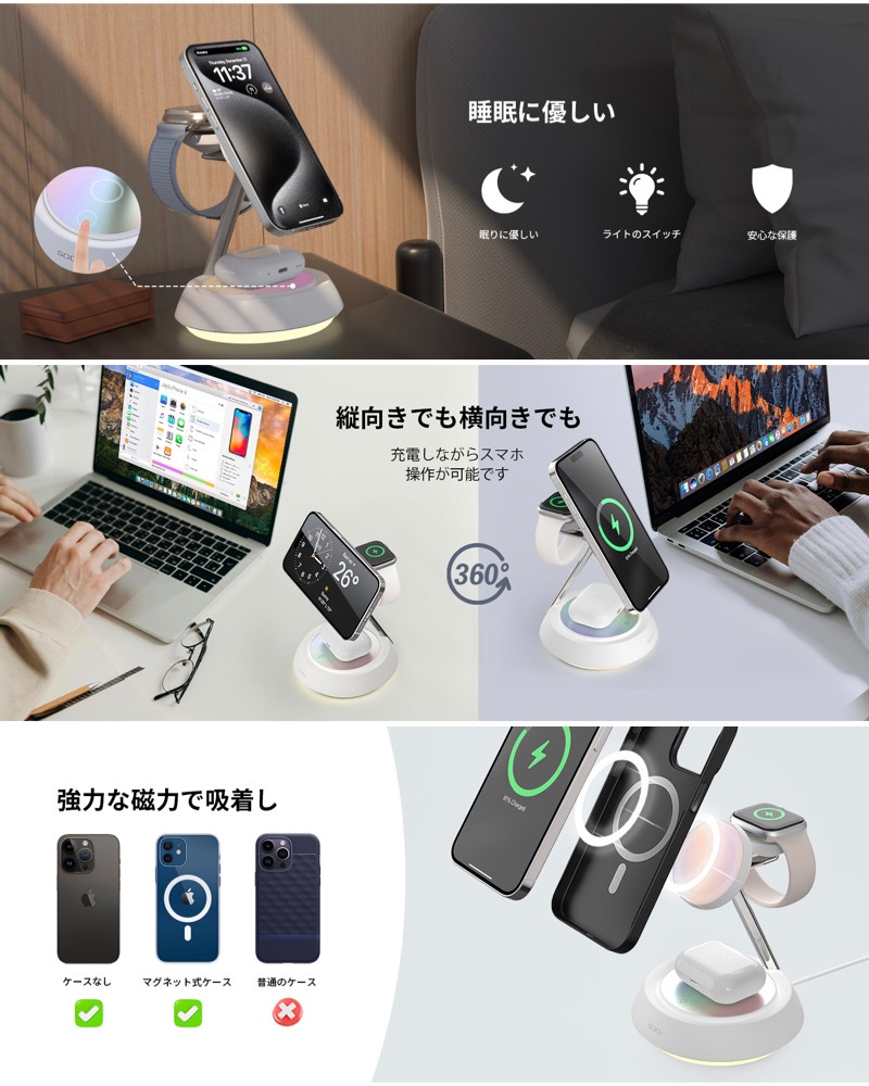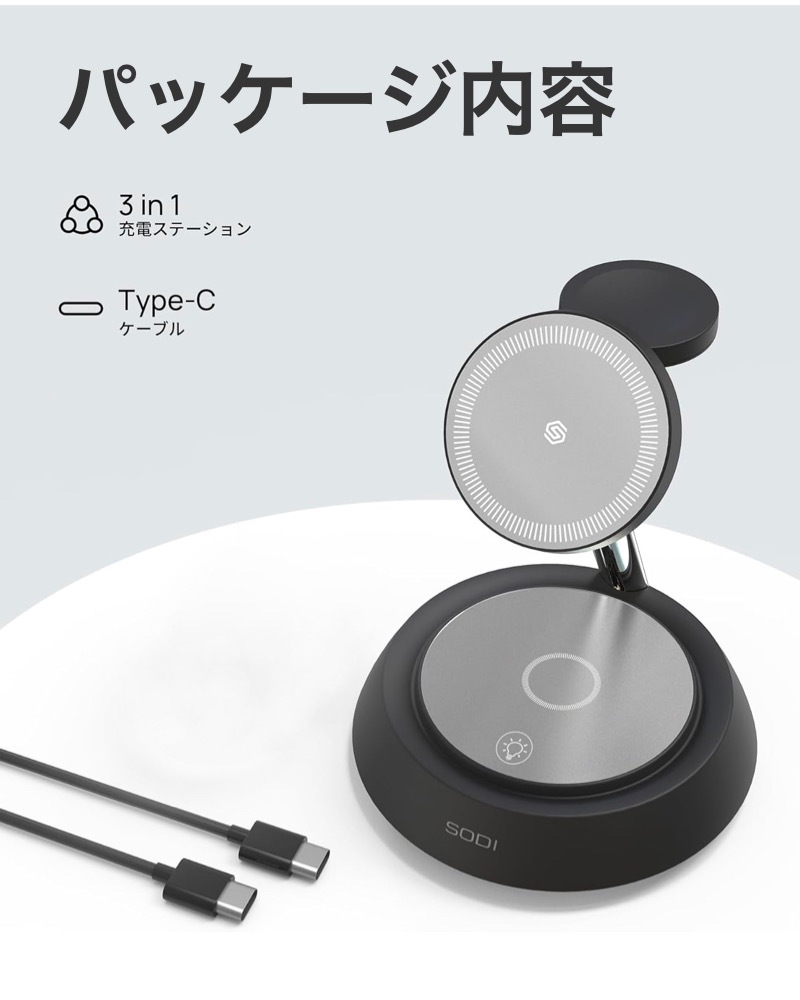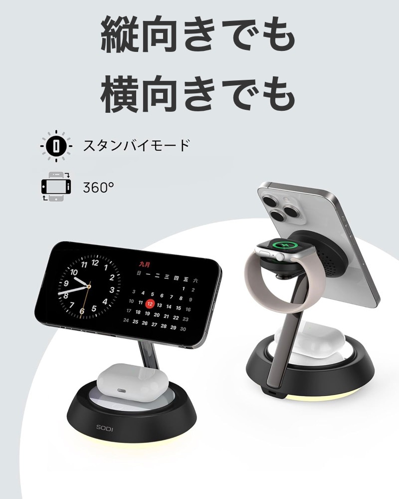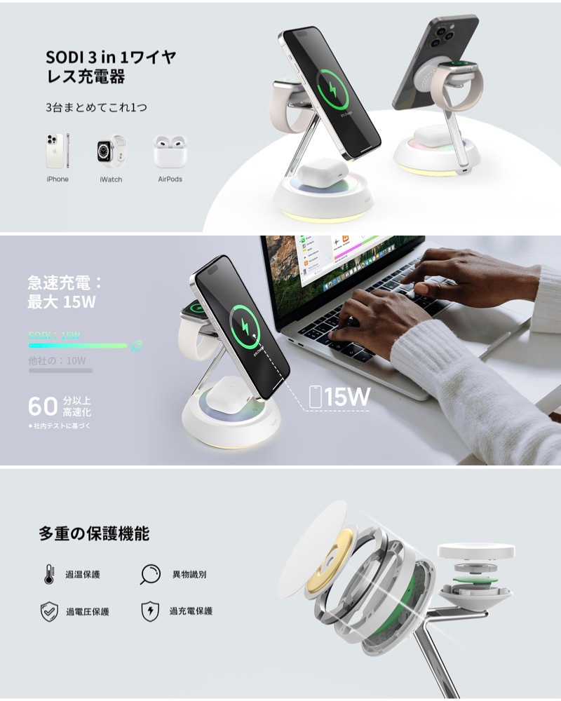 SODI 3in1 ワイヤレス充電器 MagSafe対応 充電器 マグネット式 夜間ライト設計 充電スタンド 急速充電 15W/10W/7.5W/5W iPhone15/14/13/12 Apple Watch AirPods シリーズ 日本語説明書