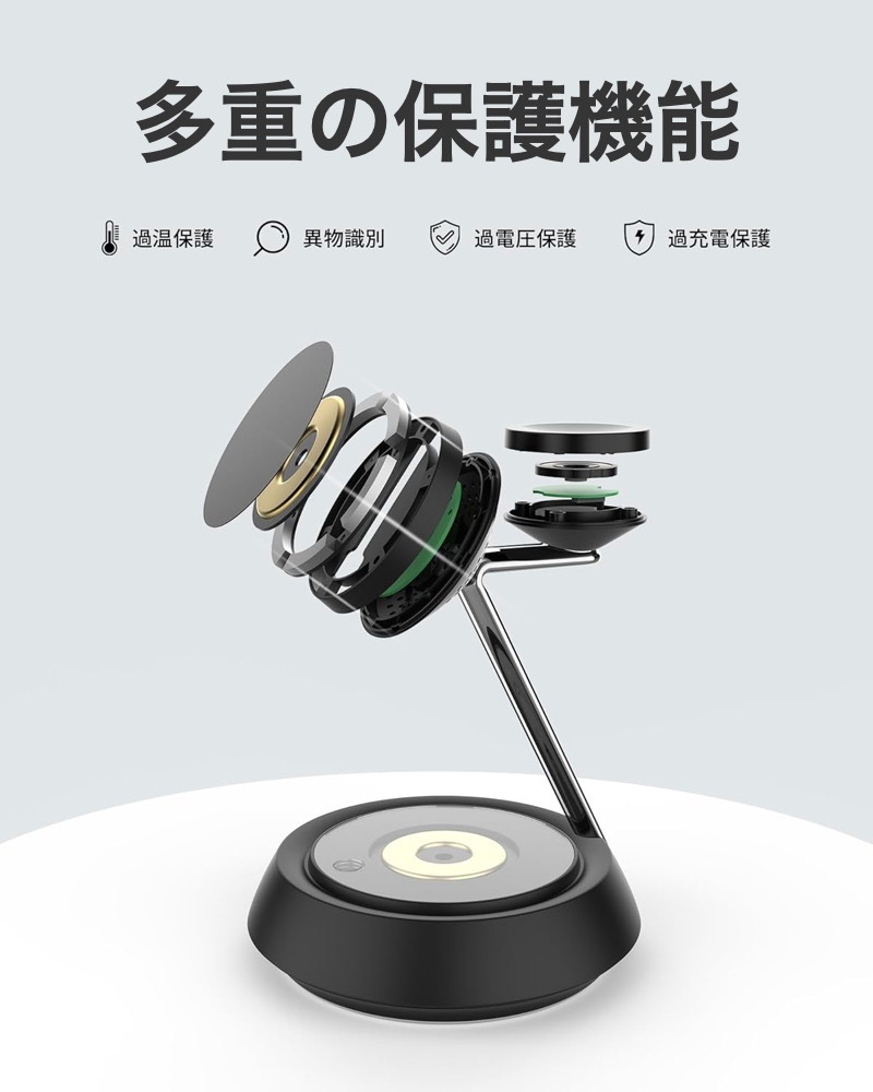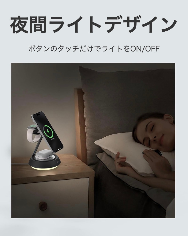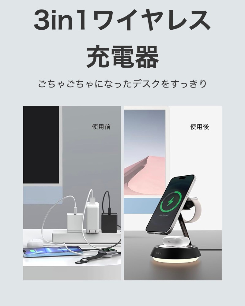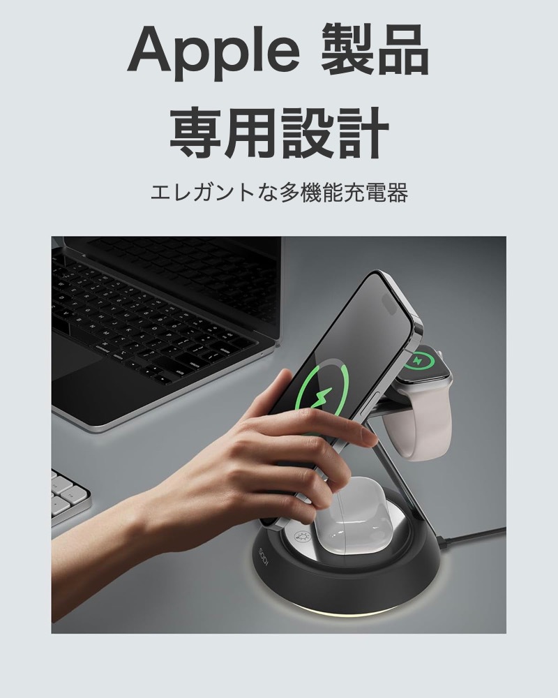 SODI 3in1 ワイヤレス充電器 MagSafe対応 充電器 マグネット式 夜間ライト設計 充電スタンド 急速充電 15W/10W/7.5W/5W iPhone15/14/13/12 Apple Watch AirPods シリーズ 日本語説明書