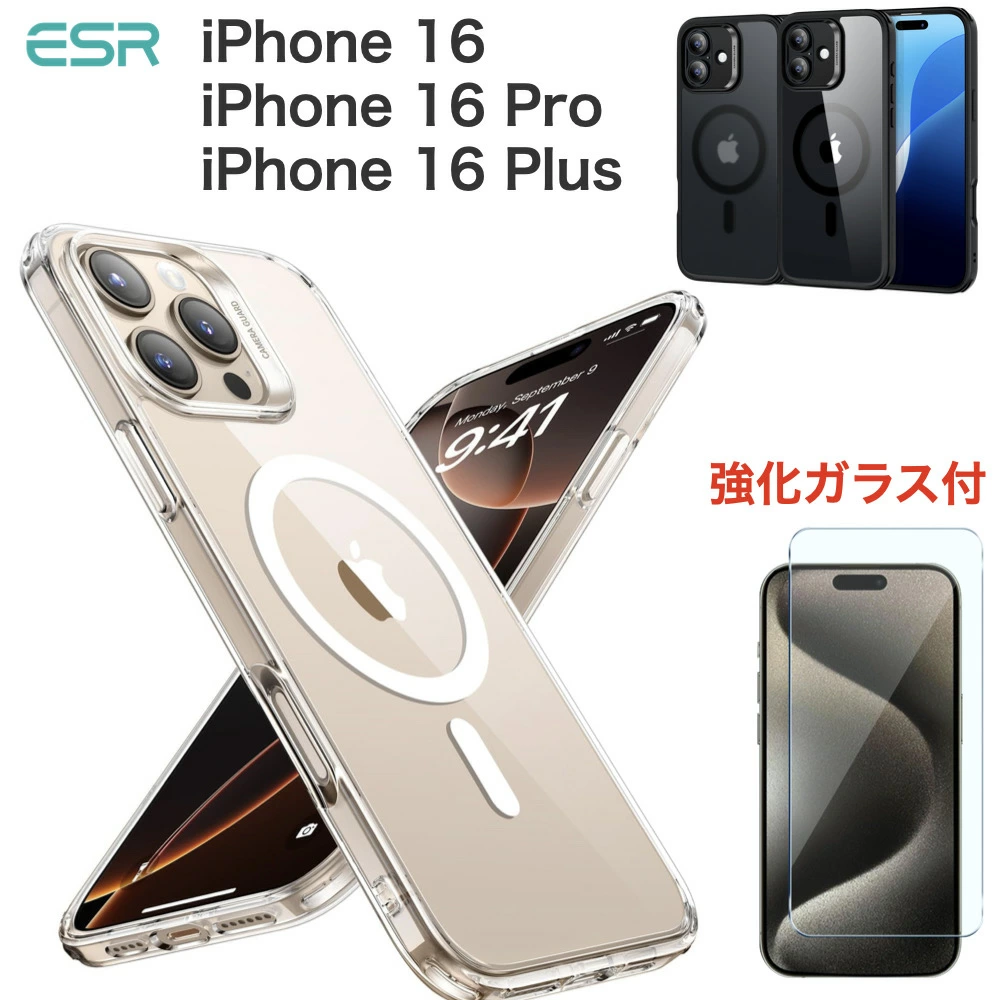 強化ガラスフィルム付【米軍MIL規格・Magsafe対応】ESR iPhone 16 Pro ケース iPhone 16 ケース iPhone 16 Plus ケース 傷に強い背面 ワイヤレス充電 ストラップホール付き 耐黄変 耐衝撃マグネットスマホケース HaloLock搭載 ハイブリッド磁気ケース クリア