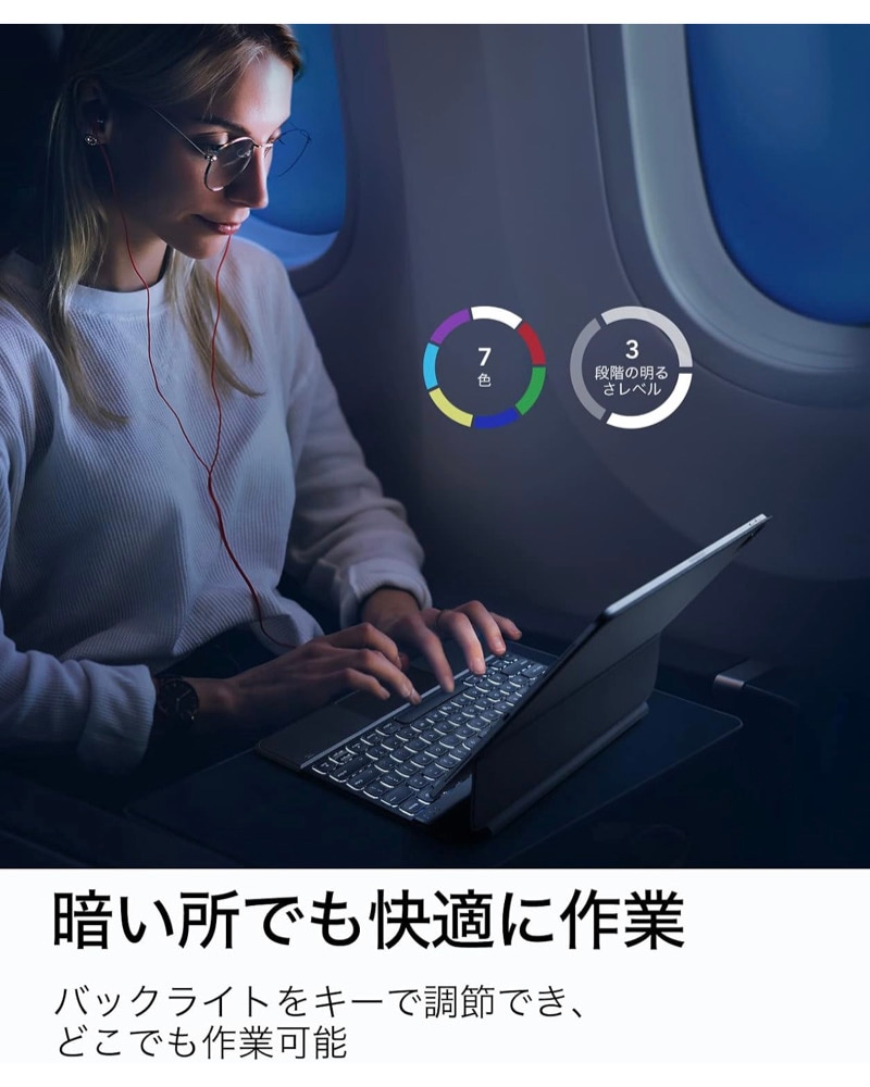 【どこでも作業可能】 あなたのiPadを作業モードに切り替えて、ケーに内蔵されたMacbookの全ての機能により、リモートワーク革命を抱きます。*キーボードは自動でスリープモードに入ります。キーボードがペアリングされて接続されている状態で一定時間使用されていない場合、約10分後に自動的に接続が解除され、電力消費が減少します。 【簡単にセットできるスタンド】 フローティングカンチレバーデザインにより、iPad を簡単に磁気で取り付けることができ、ケースを開けるだけで最適な角度を実現します。 【素早く簡単に操作可能】 マルチタッチジェスチャ付いているタッチパネルにより、Webの閲覧、プレゼンテーションの作成、ドキュメントの編集などは、生産性向上になります。*このトラックパッドは2点タッチに設定されており、全域的なタッチではありません。左下/右下の角をクリックすることでクリック機能が実現されます。 【キーを押すだけでコントロール可能】 時短ショートカットキーにより、iPadキーボードケースを上のレベルに引き上げて、スクリーンショットを撮ったり、オーディオを制御したり、またホーム画面に戻ることは簡単にでき、仕事がもっと効率的になります。 【タッチパッド】 高性能タッチパッドは高感度で指先の反応を素早く感知。ブレのない操作を実現します。 【7種類のバックライト】 3段階の光量調節と、7種類のバックライトで、状況に応じてすぐに変更できます。 【マグネット吸着】 内蔵された多数のマグネットが、カバーとiPadをしっかり密着させ安定感抜群です。 【Apple Pencil 2 対応】 オープンサイドデザイン(iPad側面が覆われていない)により、Apple PencilのiPadへのペアリングとワイヤレス充電機能に対応しています。 【視聴&タイピング 2段階スタンド】 三つ折りフロントカバーにより、映画の視聴とキーボード入力に合わせた2通りのスタンド角度を調整できます。 【反応抜群 オートスリープ/ウェイクアップ】 強力なマグネットにより、オートスリープ/ウェイクアップ機能がしっかり素早く動作します。 |