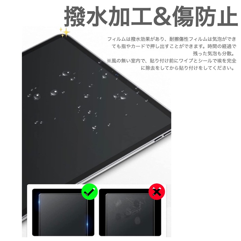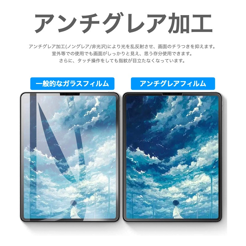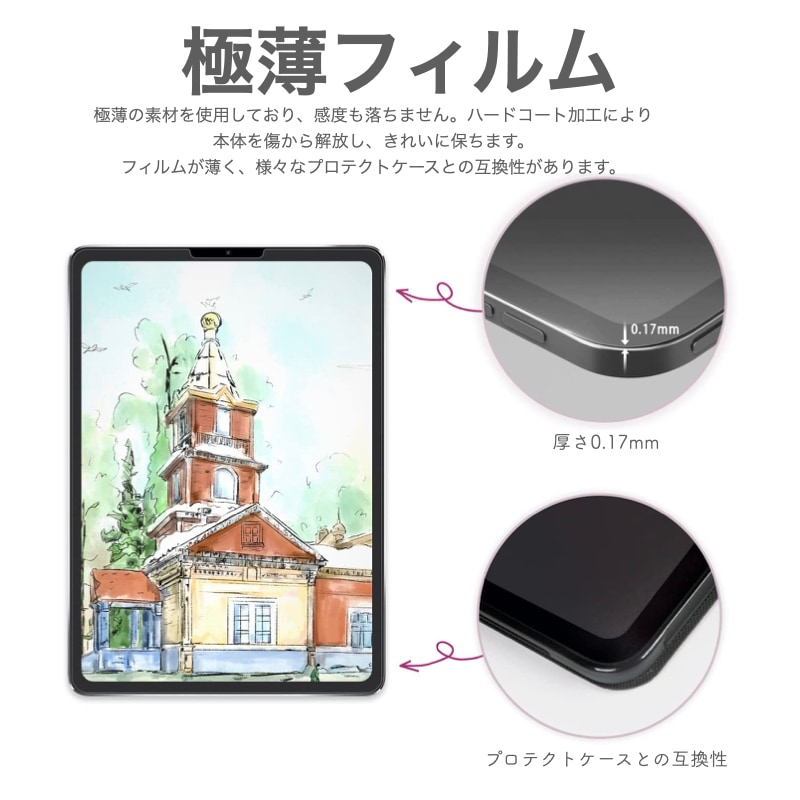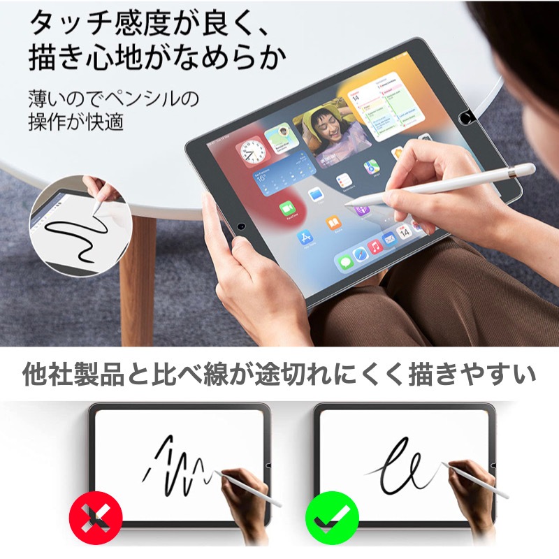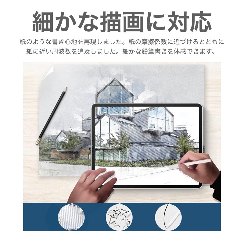 【紙に書くような感覚】 表面を特別処理することで、紙の上に書いたり描いたりするような感覚をお楽しみいただけます。 【何度でも貼りなおせる】 簡単な貼り付けと、もし間違って貼ってしまったり空気が入っても何度でも貼りなおせます。 【PENCIL & FACE ID対応】 厚さたった0.17 mmで、Pencil使用時に高いタッチ感度を保ちます。カメラ/マイク用に正確にカット加工しているので、音質やFace IDには全然影響ありません。 【反射や指紋を低減】 マット仕上げにより指紋がつくのを防ぎ、人工光と自然光の両方からのまぶしさを低減します。 |