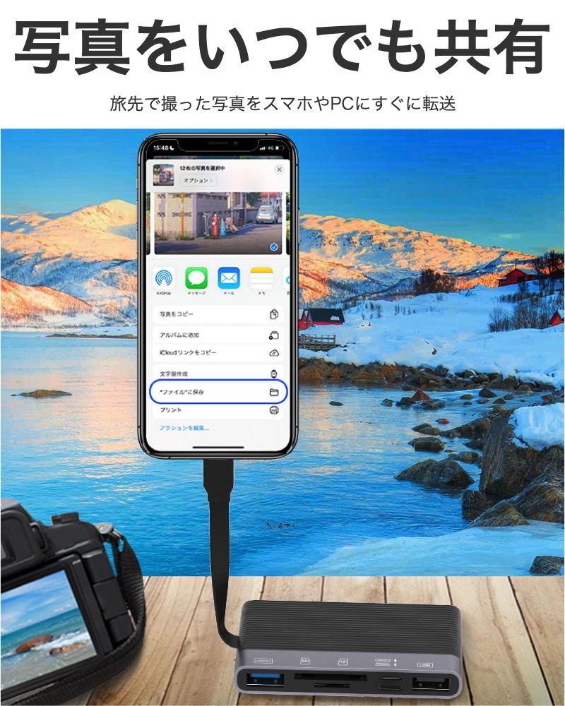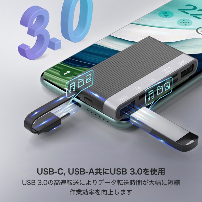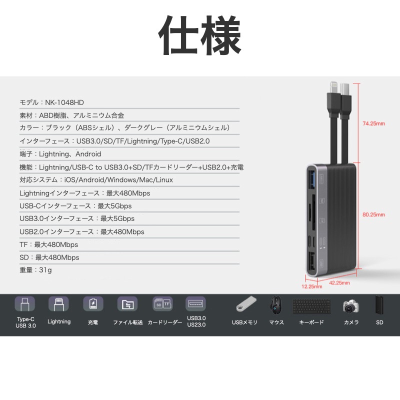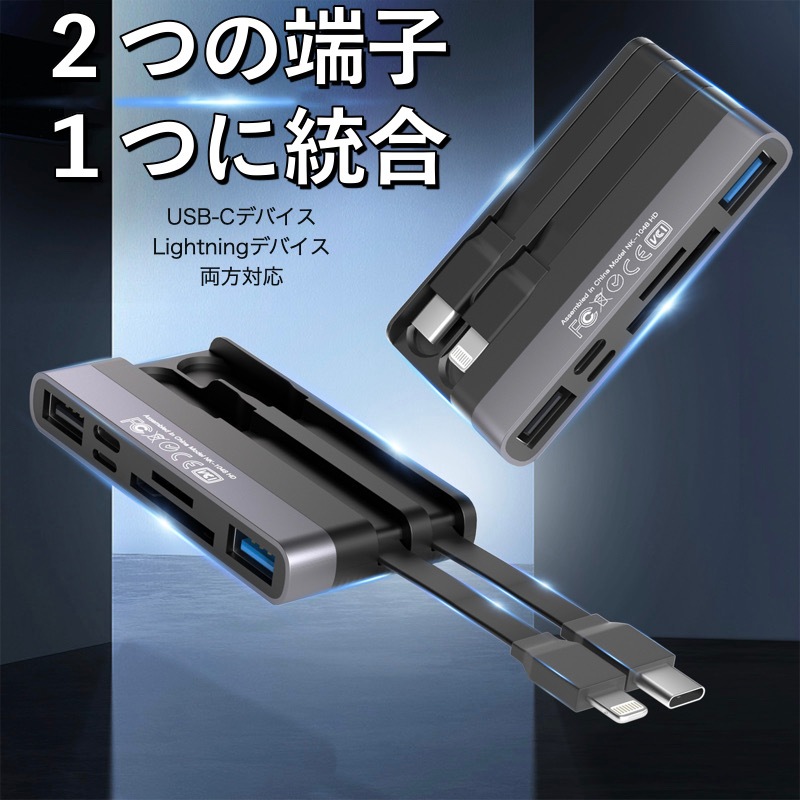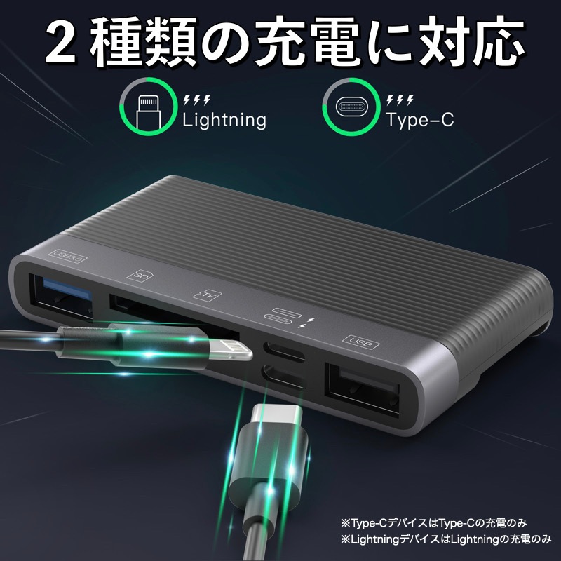 【iOS 13以降のバージョンと互換性がある6in1アダプター】 ・PC・スマホ・iPhone・タブレット等いろんなデバイスに対応。 ・デバイスをさらに便利に活用:「SD」+「TF」+「USB 3.0」+「USB 2.0」+「Lightning」+「USB-C」 充電が同時にできるので、充電を気にする必要はもうありません。 ※充電は各デバイスの充電規格により異なります。 ・[高速で便利なデータ転送] SDカード/TFカードにより、カメラからタブレット・Androidスマートフォン、iPhoneやiPadに写真やビデオを転送するのがより便利で簡単です。 ・[コンパクトボディ] コンパクトで軽量、わずか31g。持ち運びにも便利。 ・[USB3.0] 備えたUSB3.0ポートはUSB2.0の約10倍の転送スピード。データの取り出し、取り込みに最適。 |
