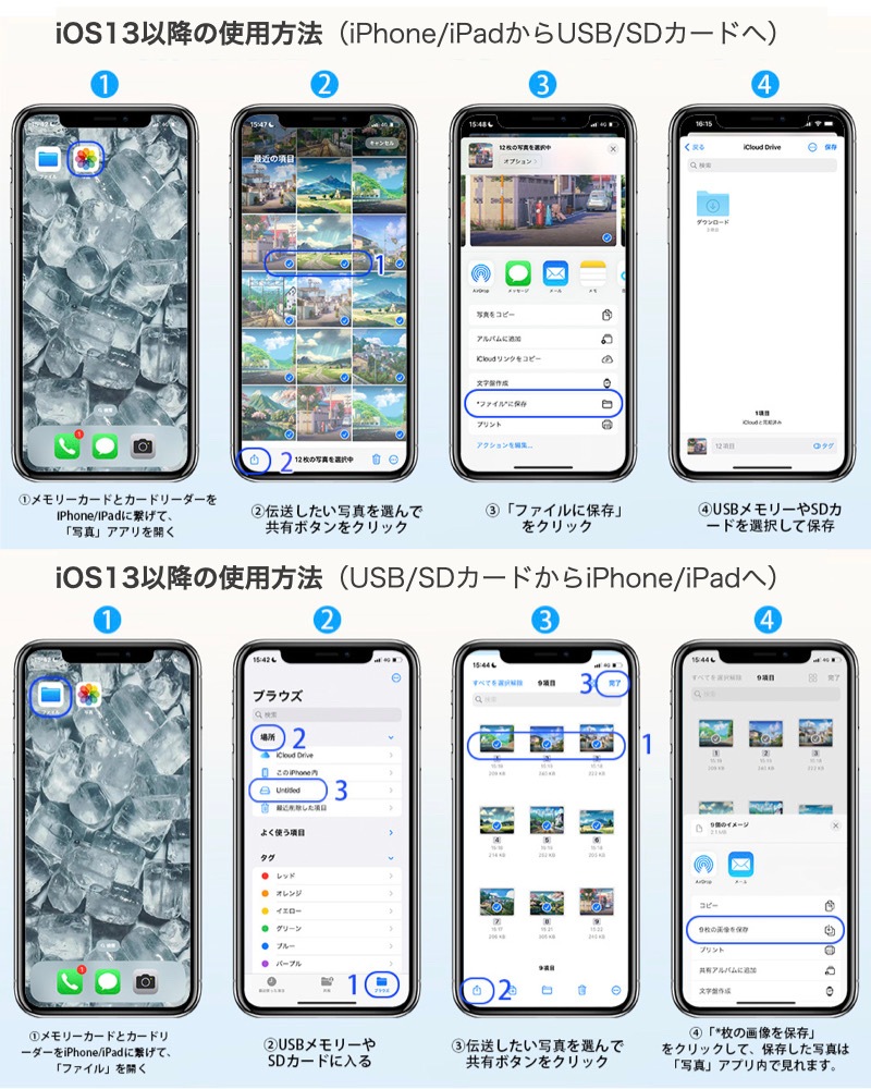 | iOSのデータ転送方法 | 【USBメモリ、SDカード内のデータの確認について】 1、iPhoneに元々あるデフォルトのアプリ「ファイル」を開きます。 2、右下にある「ブラウズ」をタップ。 3、場所のお項目にUSBメモリの場合、「Untitled」が表示されます。SDカードの場合、「NO NAME」が表示されます。※「ブラウズ」が表示されない場合は、「このiPad内」、または、「このiPone内」の下に表示されます。 ※名前が付いている場合は、その名前が表示されます。 【データをUSBメモリ、SDカードに保存する】 1、iPad/iPhoneにある保存したいデータを開きます。 2、上部/下部に表示される「シェアボタン」をタップ。 3、メニューの中にある「ファイルに保存」をタップ。 4、「USBメモリ」または、「SDカード」名をタップして保存します。 保存がされているか「ファイル」からご確認ください。 ※USBメモリの読み込み、保存等は、 [iOS13以降] にアップデートする必要があります。 ※iPhone/iPadの電源の入れ直しをすると動作する場合があります。 |