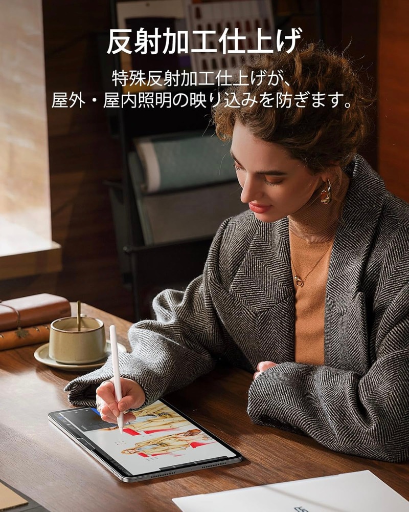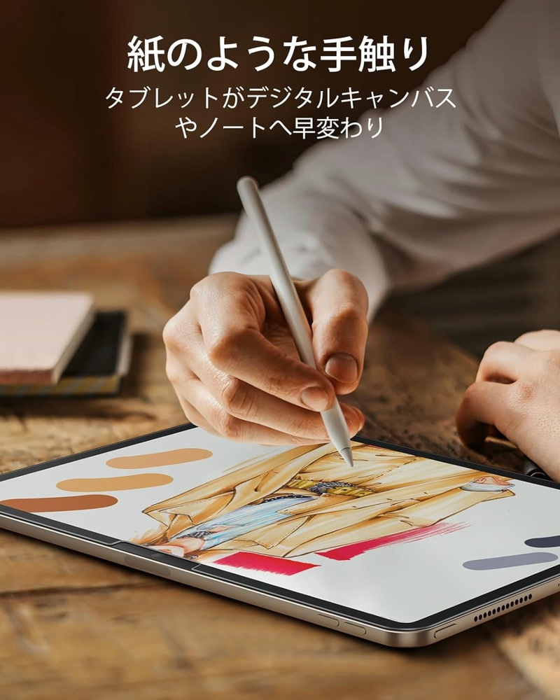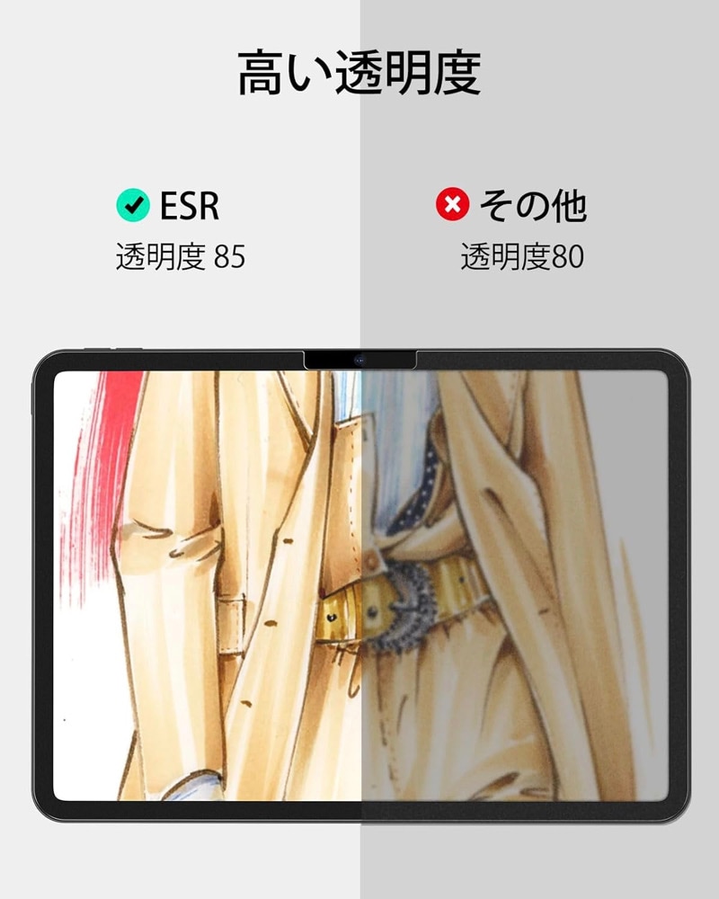 【ペンシルを紙に】 極薄で繊細なテクスチャーの表面により、適度な抵抗感で滑らかな線を描くことができ、ペン先の磨耗を最小限に抑えながら、タブレットをデジタルキャンバスやノートに変身。低減させるため、タッチペンを長く使用できます。 ※当社旧モデルと比較。 【気泡なし】 付属の取り付けフレームにより、手作業の手間と不確実性を排除し、毎回素早く簡単にバブルフリーな取り付けを可能に。 【スクラッチ保護】 鍵やケーブルによる擦り傷から画面を保護。 【業界をリードする透明度】 他の類似スクリーン保護よりも透明度が高いため、描写だけでなく、お気に入りの番組の閲覧にも最適。 |
