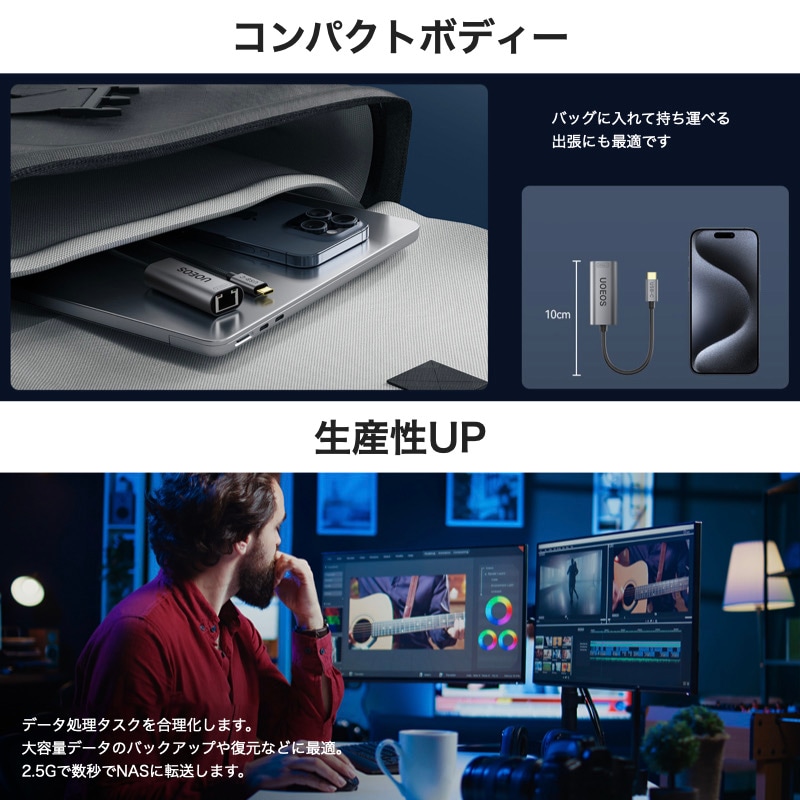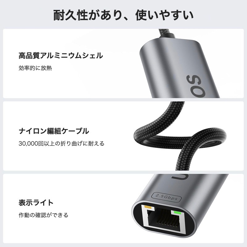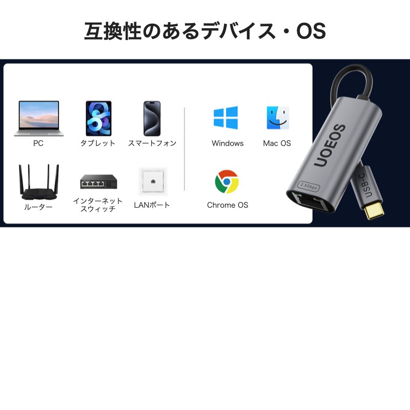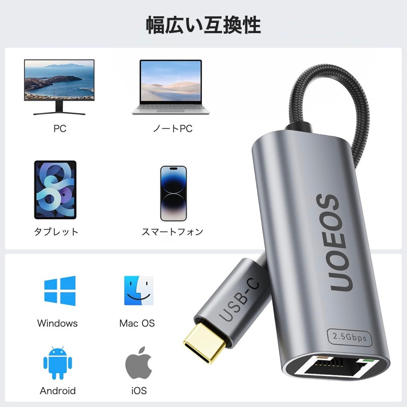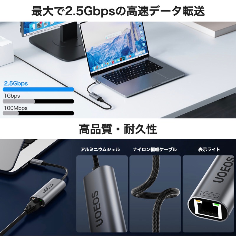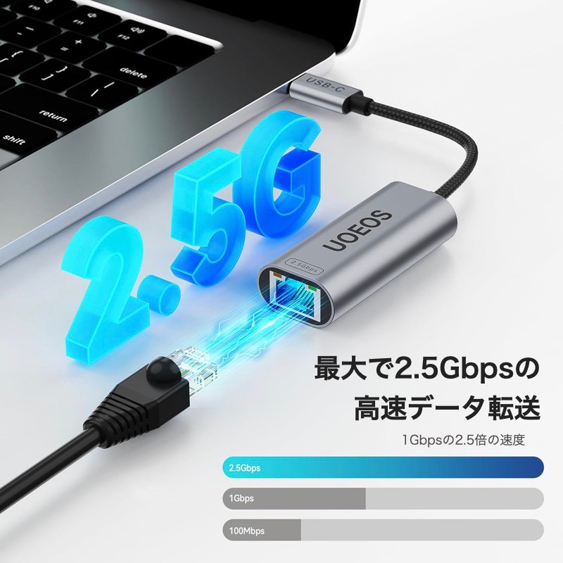 UOEOS 有線LANアダプター 2.5Gbps 超高速通信 USB Type C to RJ45 2500Mbps USB-C LAN変換アダプター イーサネットアダプター ギガビット LANケーブルiPhoneシリーズ/MacBook Pro/iPad Pro/XPS/Microsoft Surface Pro対応